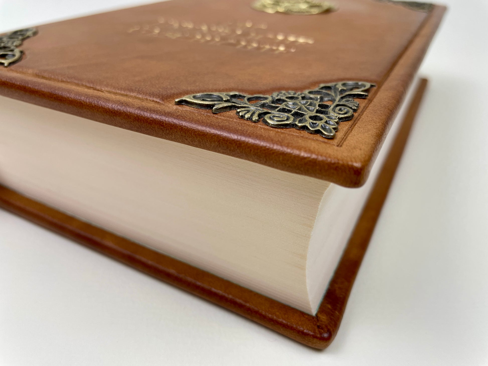 Nach traditionellem Buchbindehandwerk und einzigartiger Einbandkunst in glattes, hochwertiges braunes Leder gebunden.