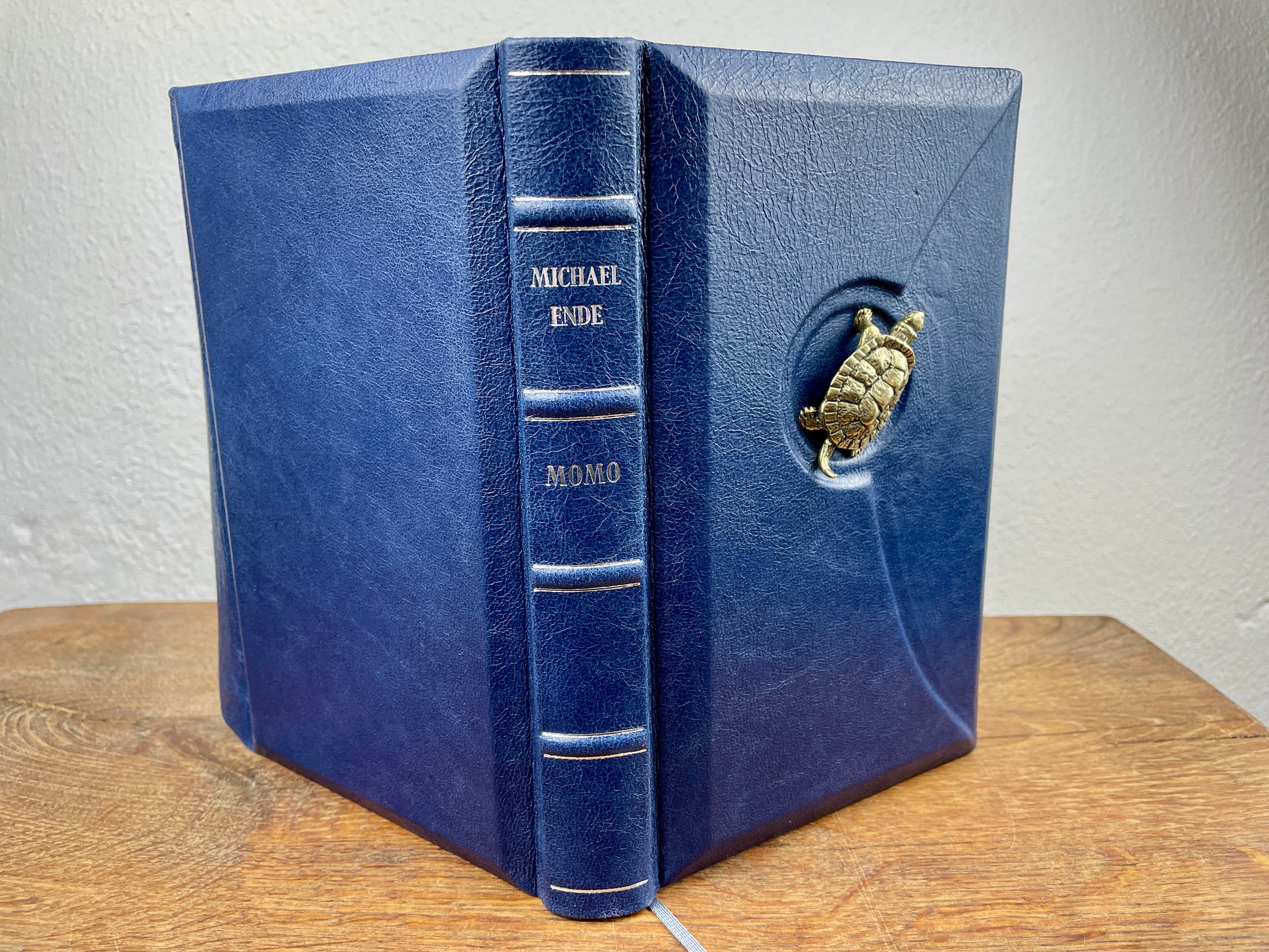 Dieses besondere Exemplar von Momo basiert auf der Thienemann-Ausgabe und wurde in meiner Handbuchbinderei vollständig neu eingekleidet. Der ursprüngliche Verlagsband wurde gekauft und erhielt von mir einen maßgefertigten Einband aus Leder. Verkauft wird daher nicht die Standardausgabe, sondern meine handwerkliche Arbeit und das gestaltete Design des Einbands.