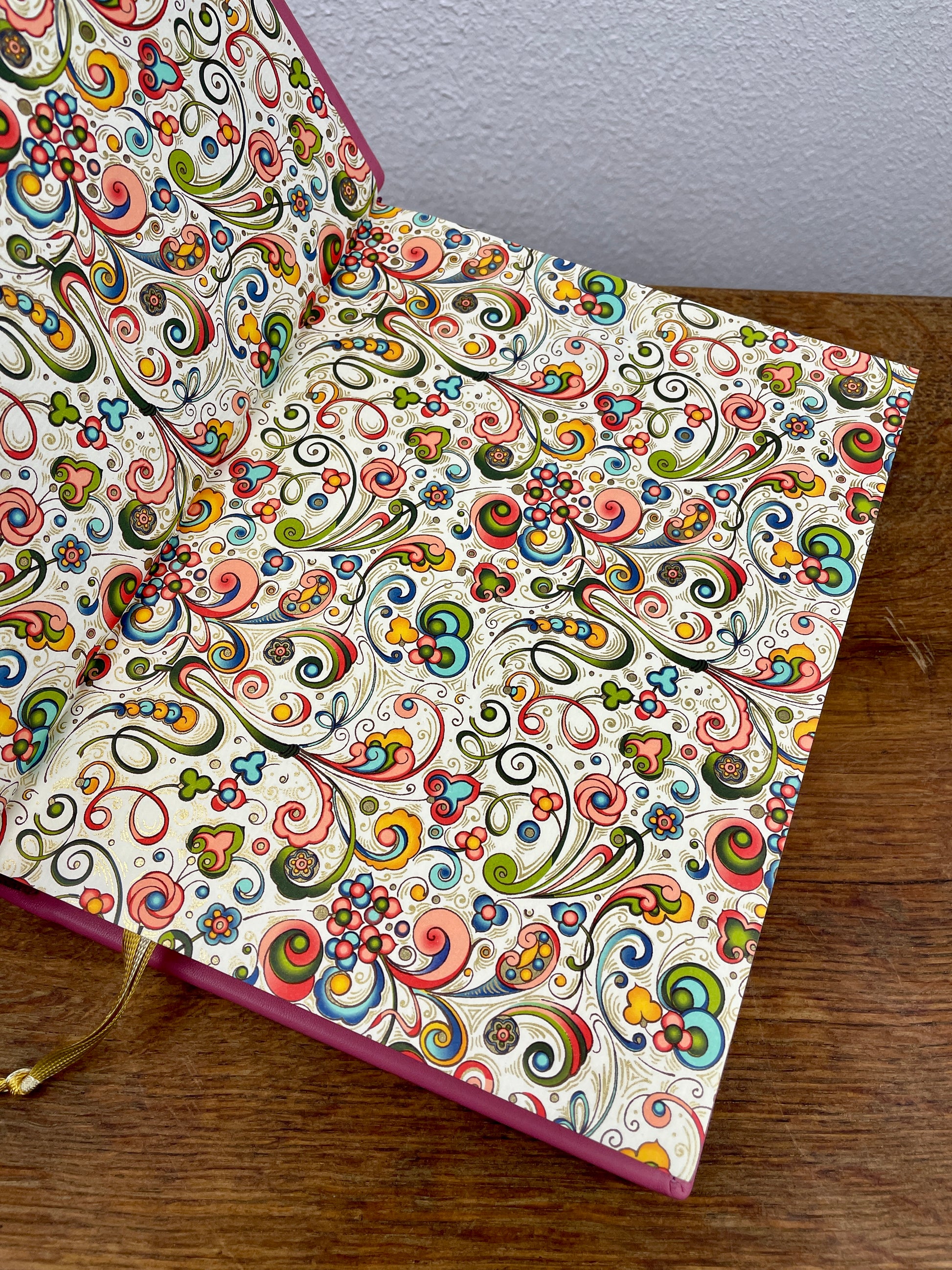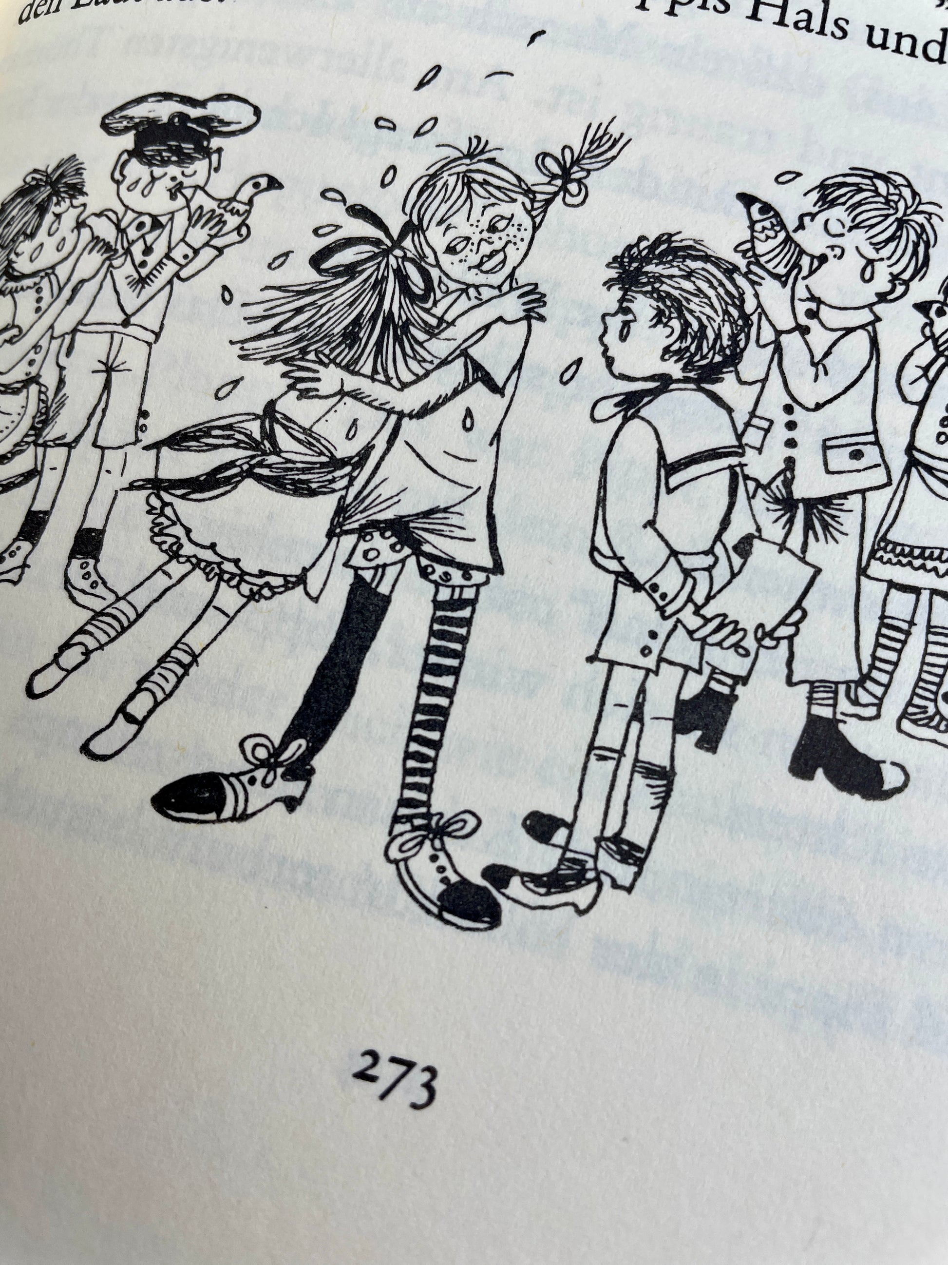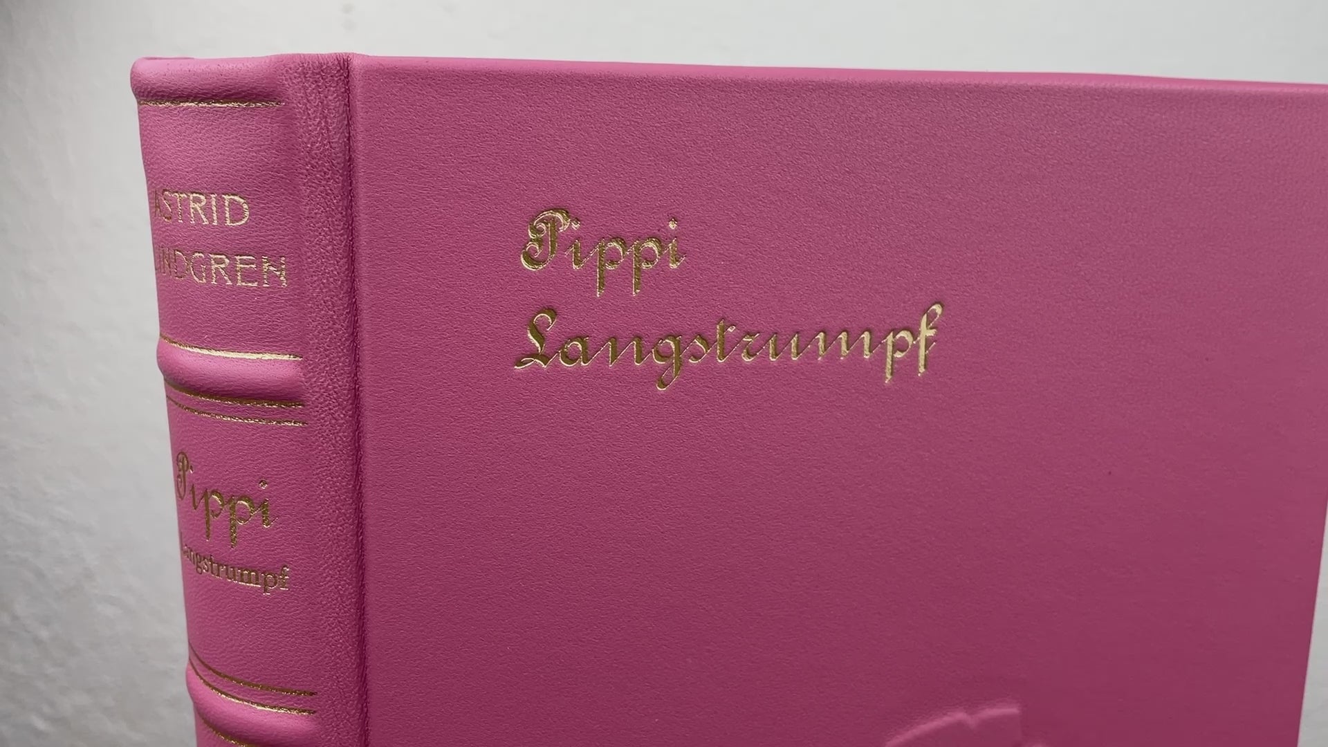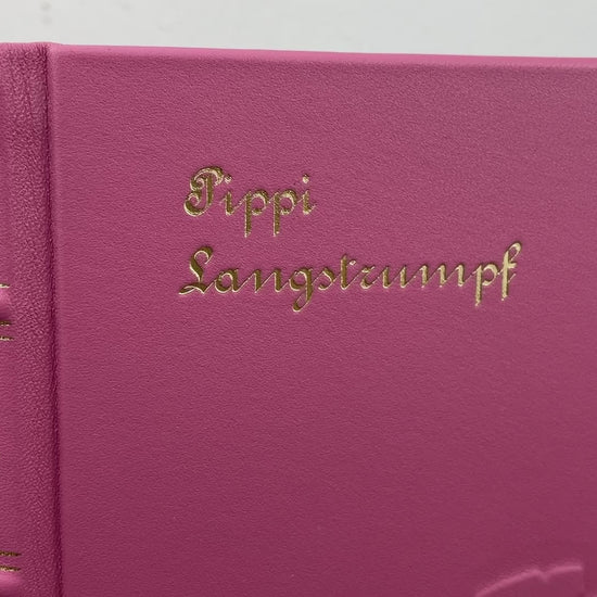 Der Einband besteht aus altrosa Leder mit einem handgearbeiteten Relief auf der Vorderseite: Pippi Langstrumpf im Handstand. Goldene Titelprägungen in antiker Schrift sowie vier erhabene Bünde mit feiner Linienvergoldung verleihen dem Buch seinen edlen Charakter. Ergänzt wird das Design durch ein gold geflochtenes Leseband und italienisches Vorsatzpapier mit Ornamenten und Goldprint.