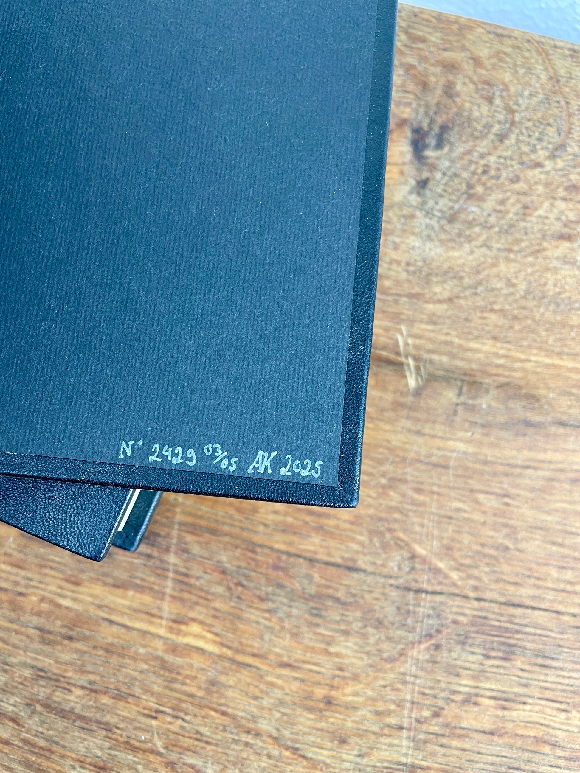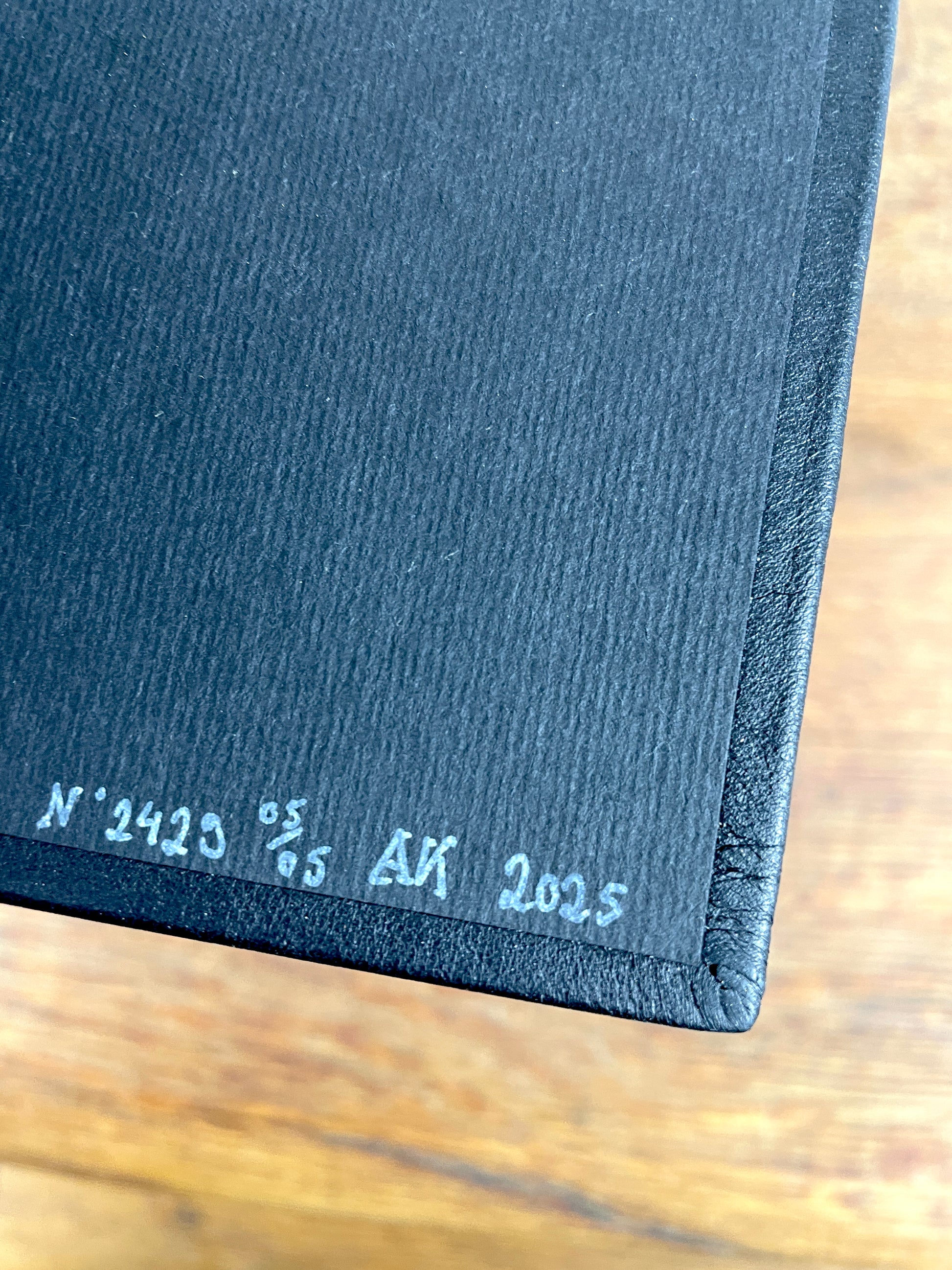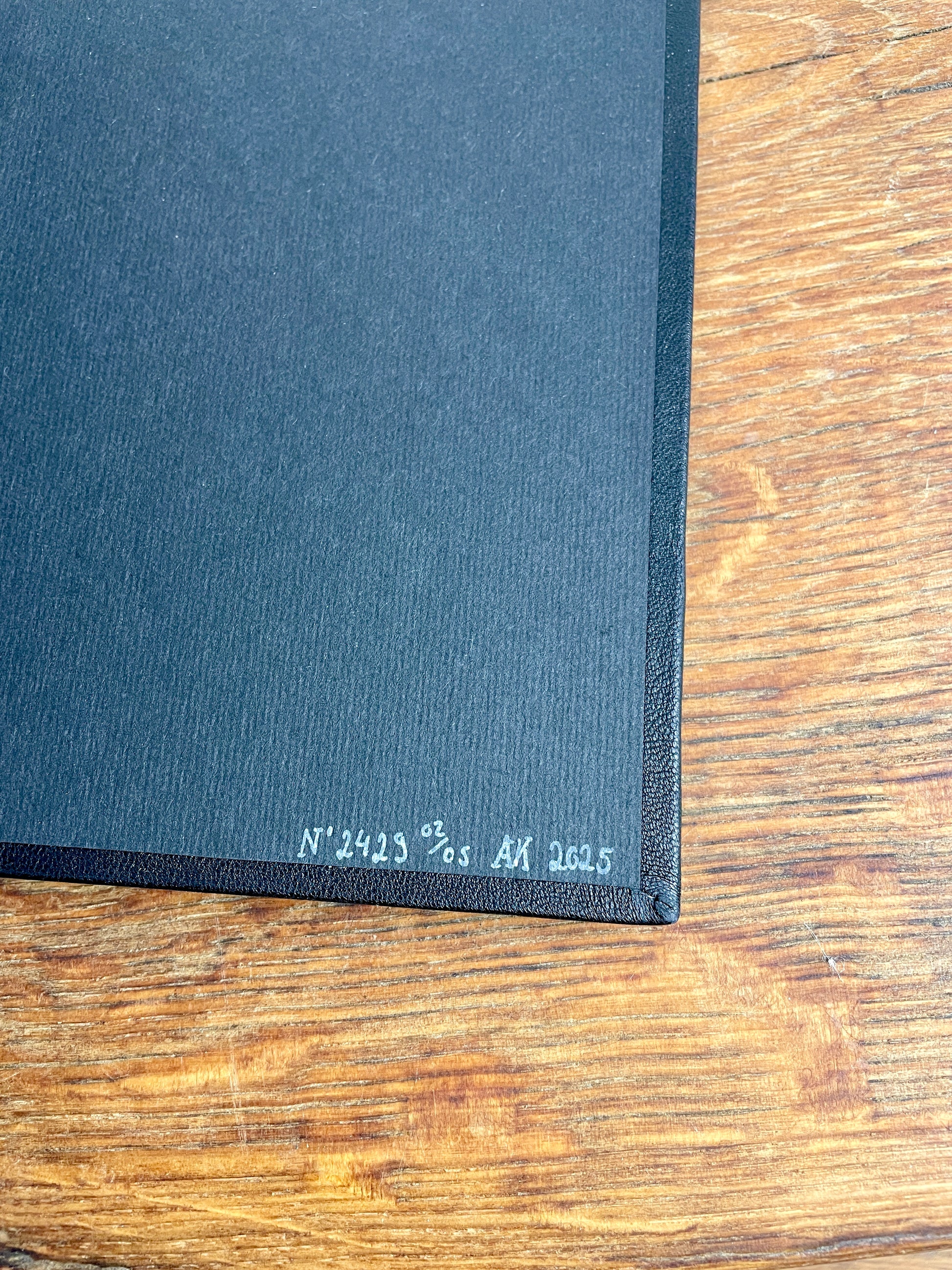 Jedes Buch ist individuell gestaltet, mit handgearbeitetem Relief, fünf erhabenen Bünden, schwarz-weißen Kapitalbändern, schwarzem Büttenpapier als Vorsatz und einem breiten schwarzen Satin-Leseband.