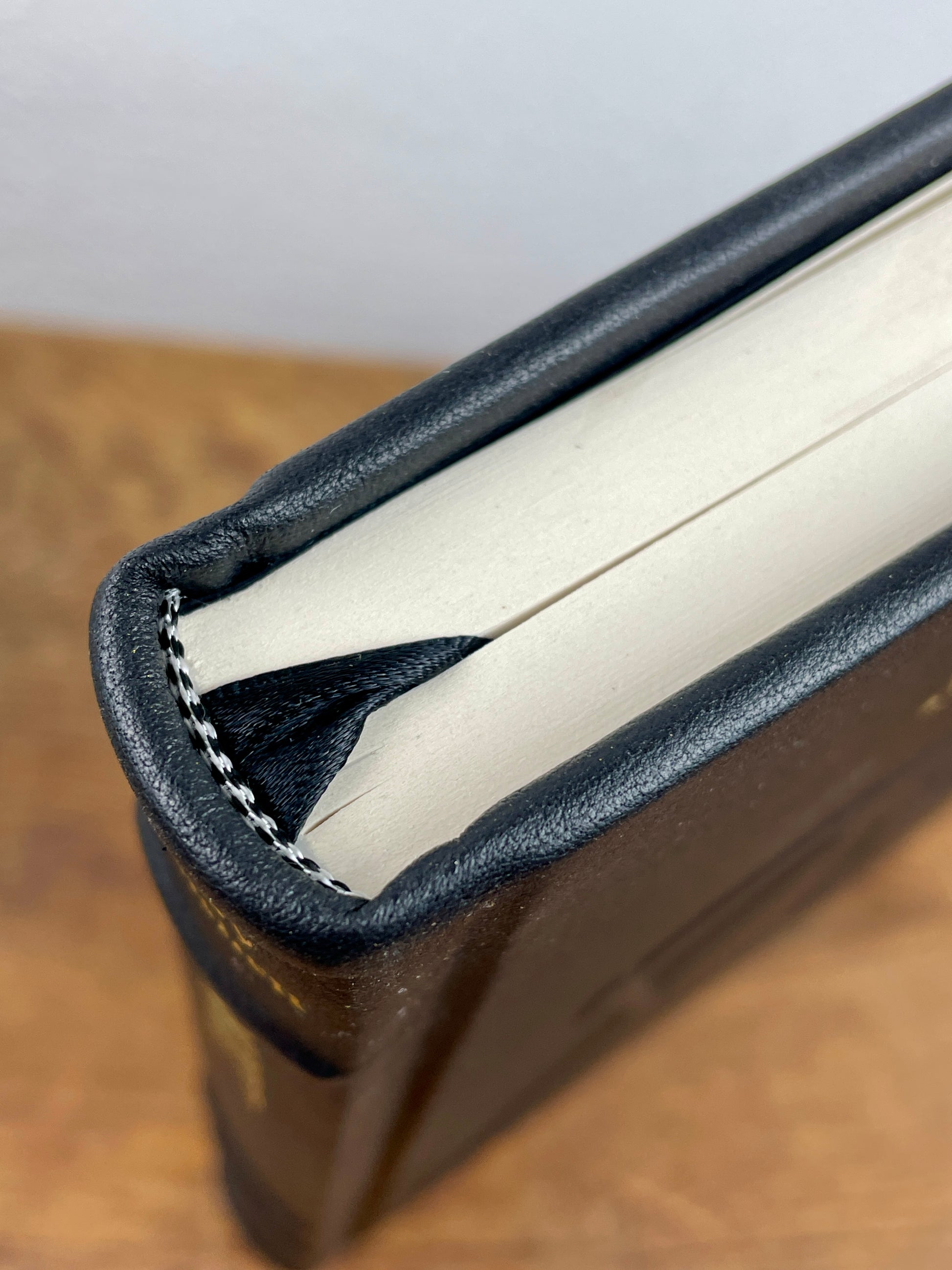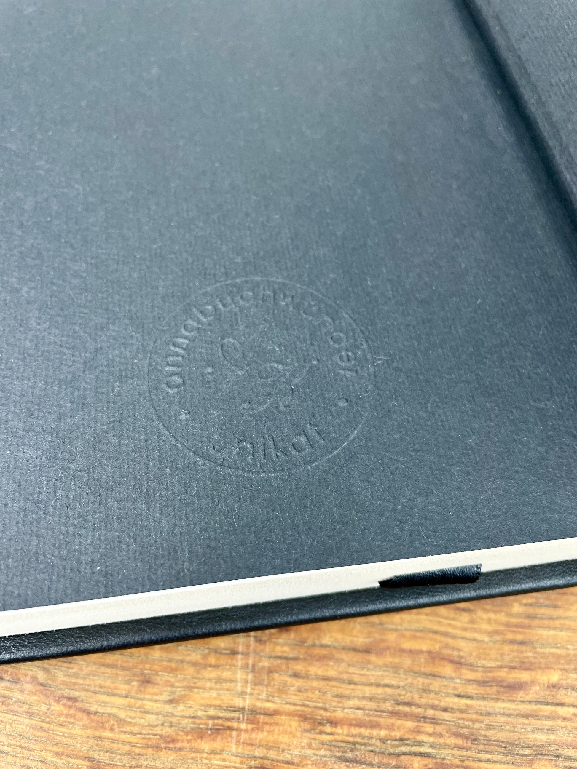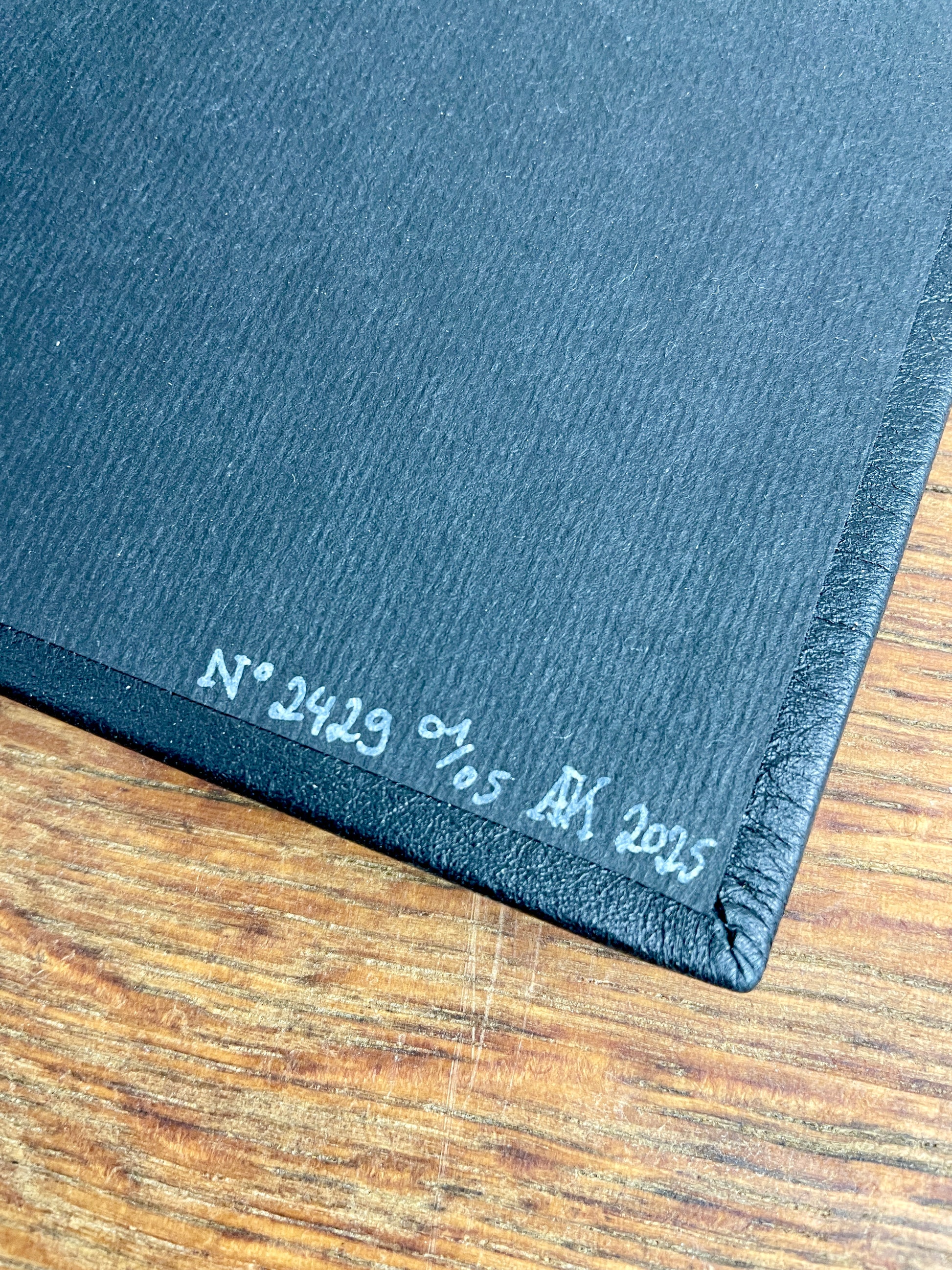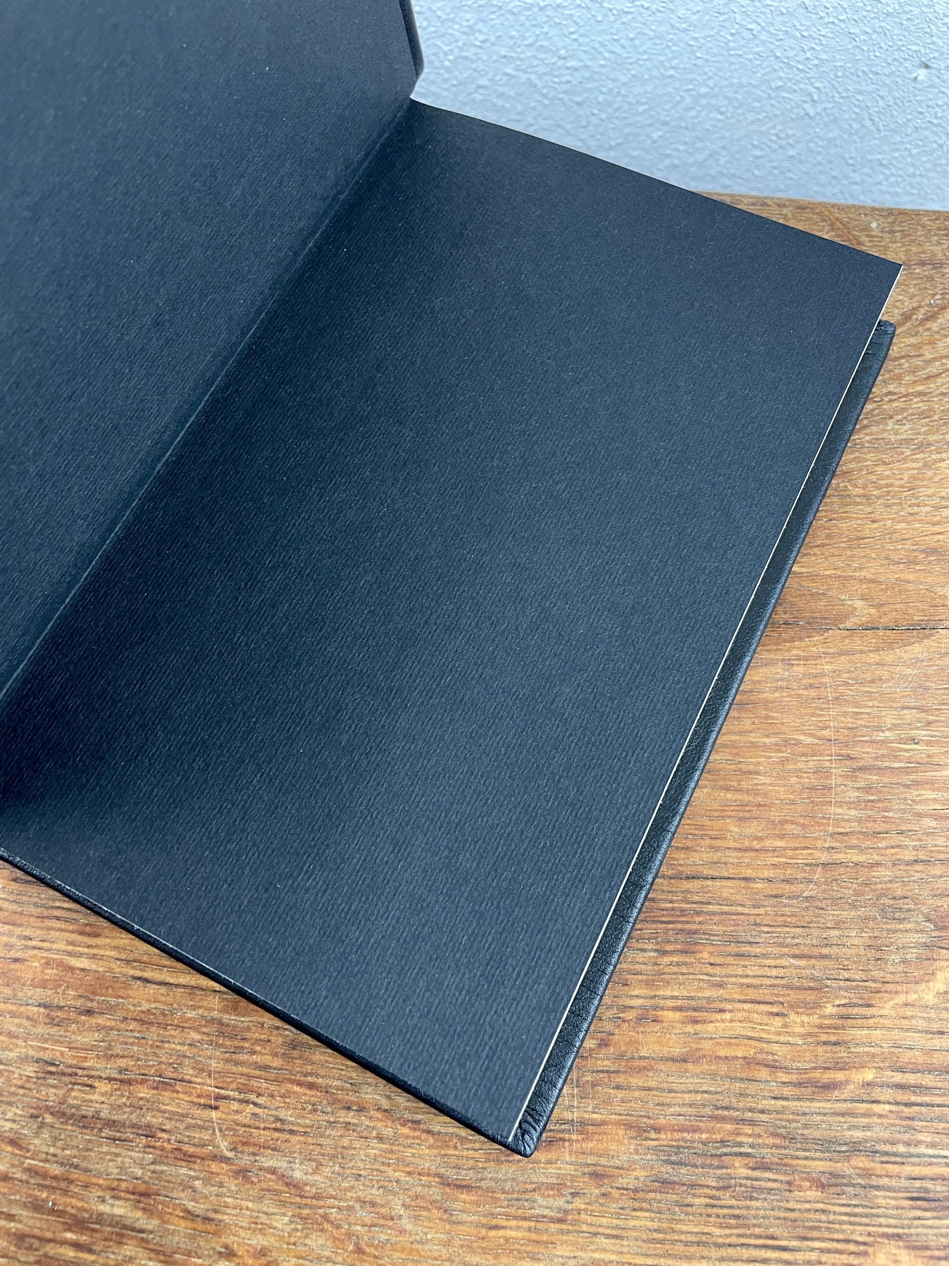 Jedes Buch ist individuell gestaltet, mit handgearbeitetem Relief, fünf erhabenen Bünden, schwarz-weißen Kapitalbändern, schwarzem Büttenpapier als Vorsatz und einem breiten schwarzen Satin-Leseband.