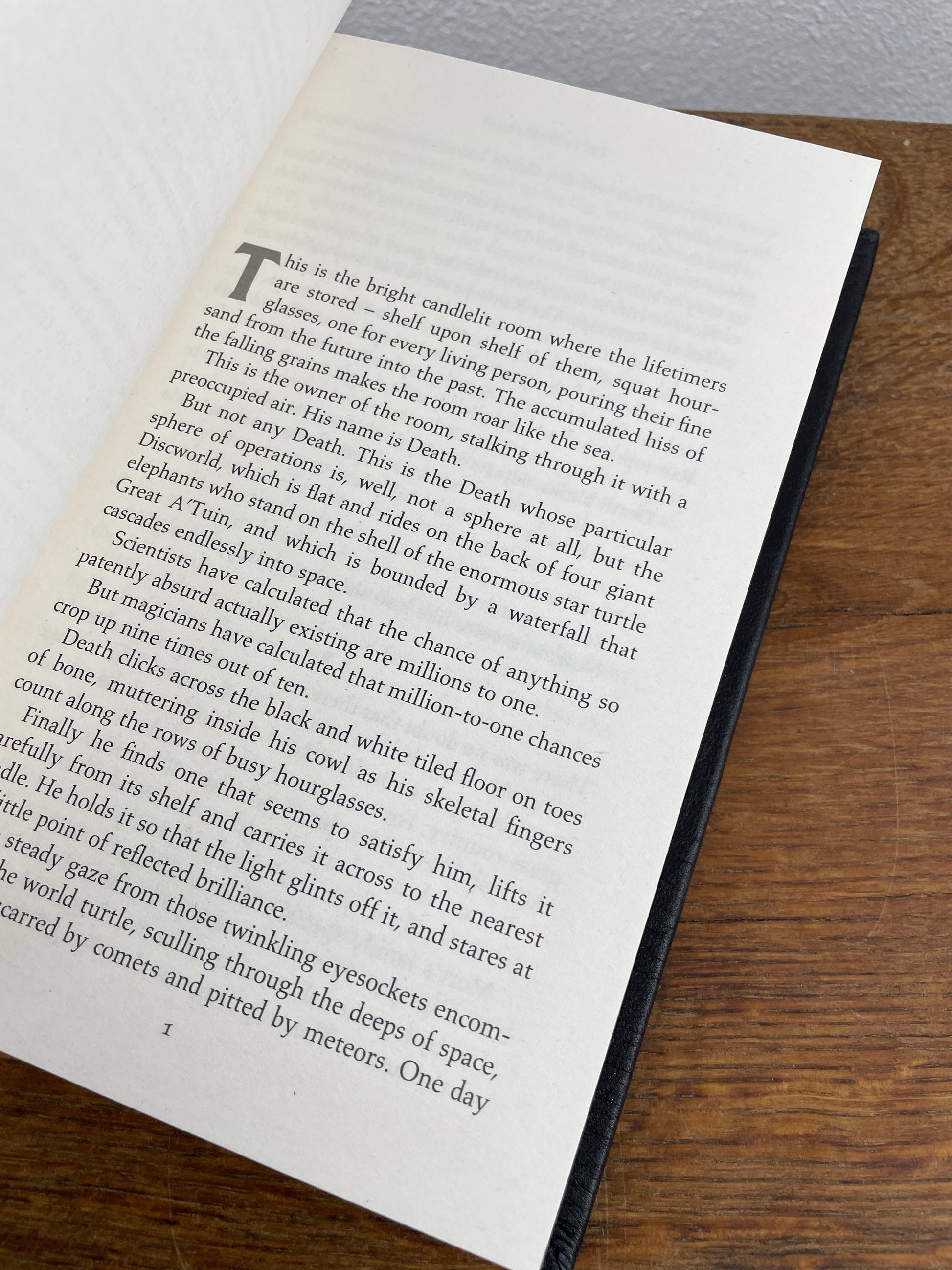 Fünf Originalausgaben der Death Series von Terry Pratchett, neu gebunden in feinem schwarzen Lammleder.